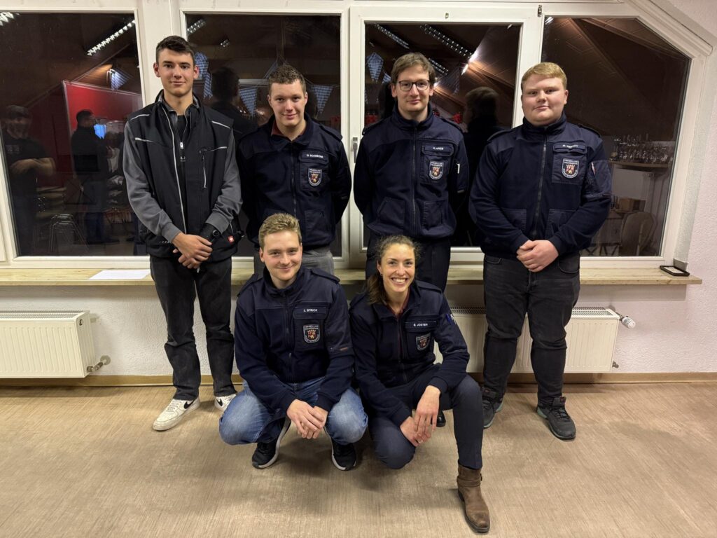 Auf dem Foto stehend von links nach rechts: Elias Reif, der an dem Abend seine Sprechfunkerprüfung abgelegt hat. Quentin Schneider, Henrik Hinze, Malte Asbach, in der Hocke: Luca Strick, Esther Josten